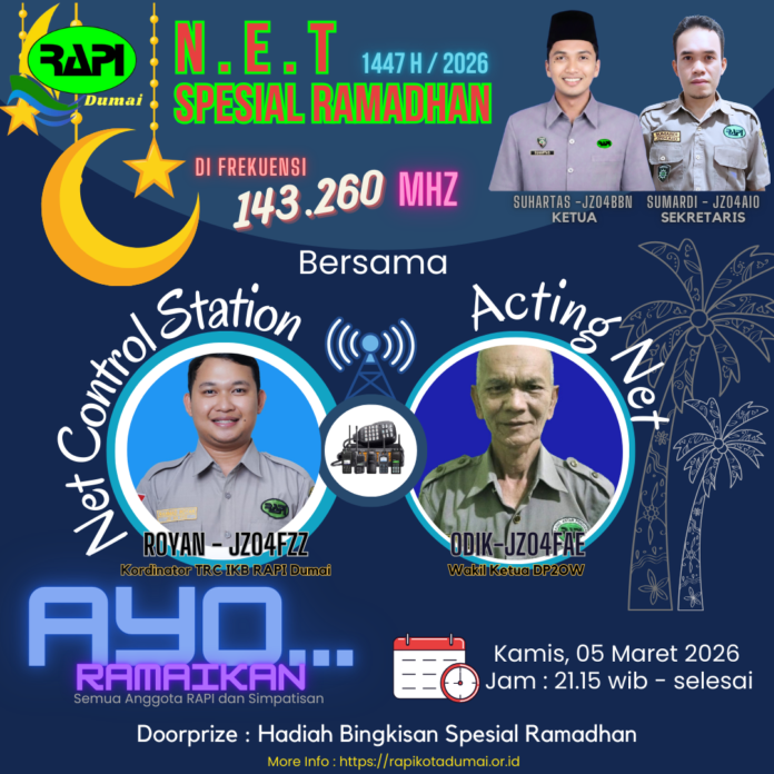 DUMAI – Pengurus Radio Antar Penduduk Indonesia (RAPI) Wilayah 04.06 Kota Dumai kembali membuat gebrakan dengan menyelenggarakan Check In NET Special Ramadhan, Kamis malam (5/3/2026). Kegiatan komunikasi radio ini berlangsung mulai pukul 21.15 WIB hingga 24.00 WIB dan diikuti puluhan anggota dari berbagai daerah di Provinsi Riau.